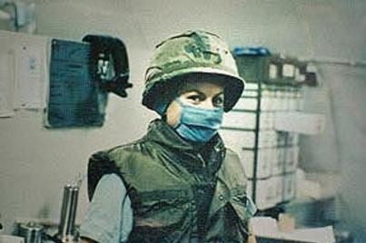 OR nurse Annie Cunningham in flak jacket and helmet.